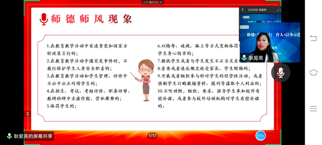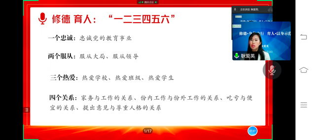 教师素质,重在师德师风,大力弘扬良好师德是教育永恒的主题。教师的一言一行、一举一动无时无刻不在潜移默化地影响着学生。12月2日晚上,beat365英国官网网站邀请耿爱英老师在腾讯会议上开展了“修德·身体力行 育人·以身示范”主题的讲座。耿爱英老师主持了此次讲座,21级全体学生参加了本次会议。