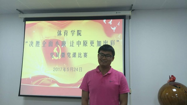 比赛中,一支部代表鲁枝鑫演讲,他以“忆改革开放,现中华雄威”为题,从军事,经济,文化三方面介绍了改革开放以来我党执政下中国的巨大变革,随后王显同志以“全面贯彻落实河南省高等教育事业“十三五”规划为题,与大家分享了河南省高等教育事业的发展与进步。