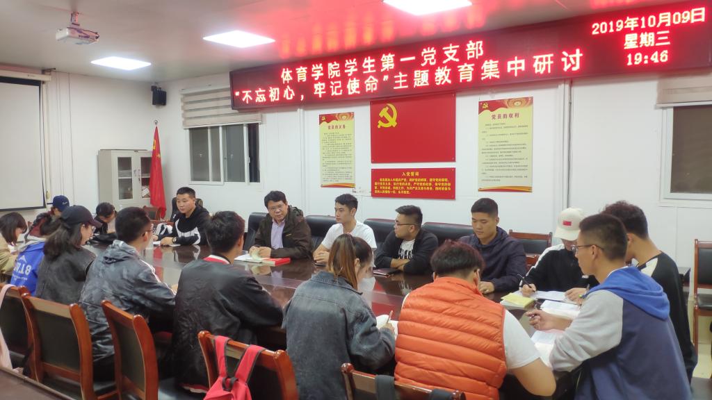 2019年10月9日晚上,beat365英国官网网站学生第一党支部“不忘初心、牢记使命”主题教育集中研讨活动在beat365英国官网网站三楼会议室举行。beat365英国官网网站副处级辅导员、学生第一党支部书记柴九昌、学生第一党支部全体党员参加研讨,研讨由柴九昌主持。