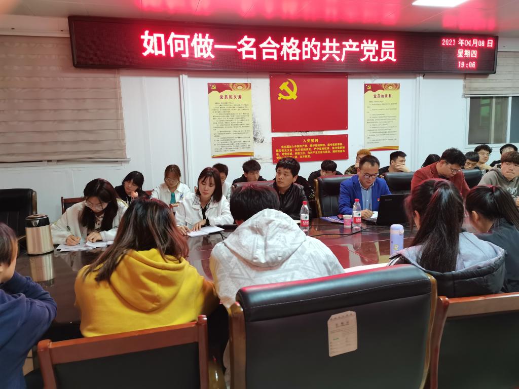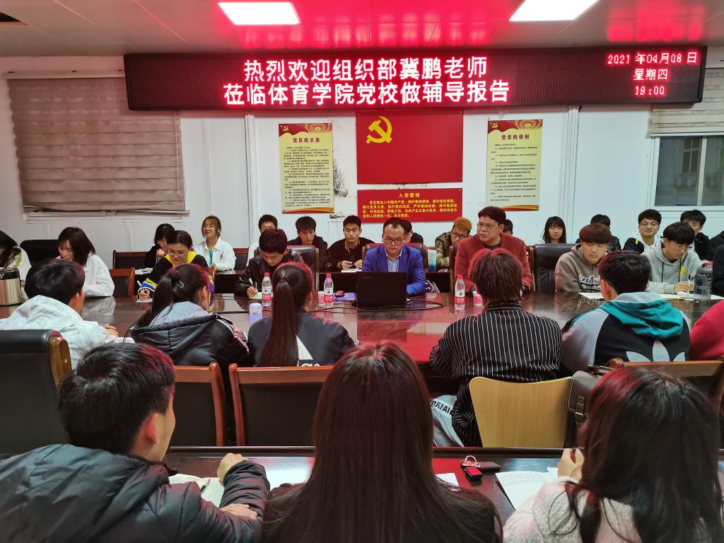 4月8日晚,信阳师范学院党委组织部组织科科长冀鹏老师为beat365官网党校第十期入党积极分子讲“如何做一名合格的共产党员”专题报告,副处级辅导员柴九昌老师、第10期党员入党积极分子培训班班主任程俊辉与60余名入党积极分子参加,报告会由柴九昌主持。