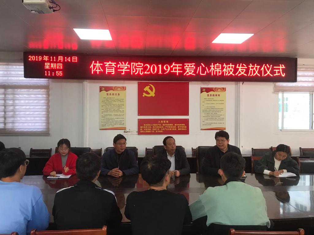 2019年11月14日beat365英国官网网站在三楼会议室开展“寒冬送温暖”棉被发放仪式。党委书记陈青、副院长牛林杰、副处级辅导员柴九昌、辅导员赵倩倩、赖梦玥出席棉被发放仪式。棉被发放仪式上,首先由柴九昌老师讲明发放棉被的目的、受助同学的评选标准。接着,柴老师对同学们进行感恩教育,一床棉被很小,但是这床棉被了灌注了学校、学院对同学们的关心与爱护。不仅如此,这床棉被还教会同学们做个学会感恩、懂得感恩的人,并希望同学们以后能在社会中将这份爱传递下去。随后,党委书记陈青发表讲话。陈书记指出,学校历来重视家庭经济困难学生资助工作,学院领导和老师都非常关心家庭经济困难学生的学习和生活。学校会尽最大努力解决生活困难学生的实际问题。最后,陈书记对同学们提出希望,在困境中要拥有乐观的心态,面对困境要有自强不息的精神,立志成才,努力奋斗。