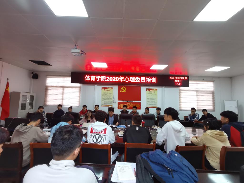 2020年10月下旬,体育学院组织了开展两期心理委员培训。院心理健康中心全体成员、各班班长、团支书、心理委员参加培训,第一期由副处级辅导员柴九昌主讲,第二期由学院心理负责人程俊辉主讲