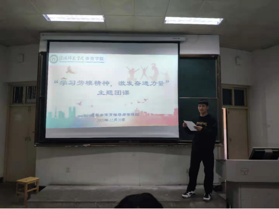 为深入学习习近平总书记在2020年11月24日的全国劳动模范和先进工作者表彰大会上关于劳模精神的重要讲话,培养新时代青年大学生艰苦奋斗吃苦耐劳的精神。beat365英国官网网站2019级社会体育指导与管理班在12月20日上午于人文楼109举办了以学习劳模精神为主题的团课,此次团课由团支书带领19级社体班全体同学进行学习。