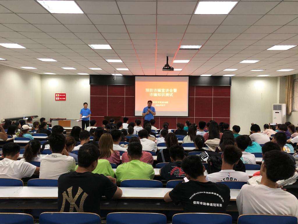 高校电信网络诈骗案件高发频发,为切实提高beat365官网学生防范意识与能力,维护学生的财产安全,6月21日下午6点在体育馆多媒体召开“预防诈骗宣讲会暨诈骗知识测试”大会,2018级全体同学参加,本次宣讲会由副处级辅导员柴九昌主讲,2018级辅导员程俊辉主持。
