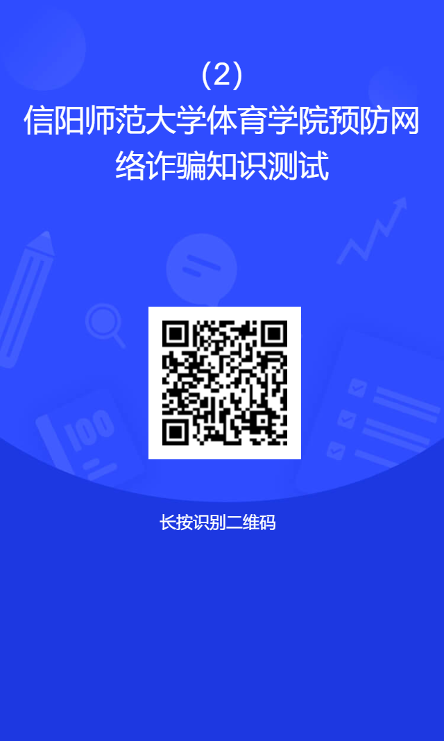 测试时间:10月24日-25日,参加同学为在知识竞赛中成绩没有达到95分及以上的的同学,测试期间,同学们扫描“预防网络诈骗知识测试”二维码进行答题,知识测试每人有多次测试机会,测试合格分数为95分,达不到95分的同学可多次进行测试,直至达到95分为止。
