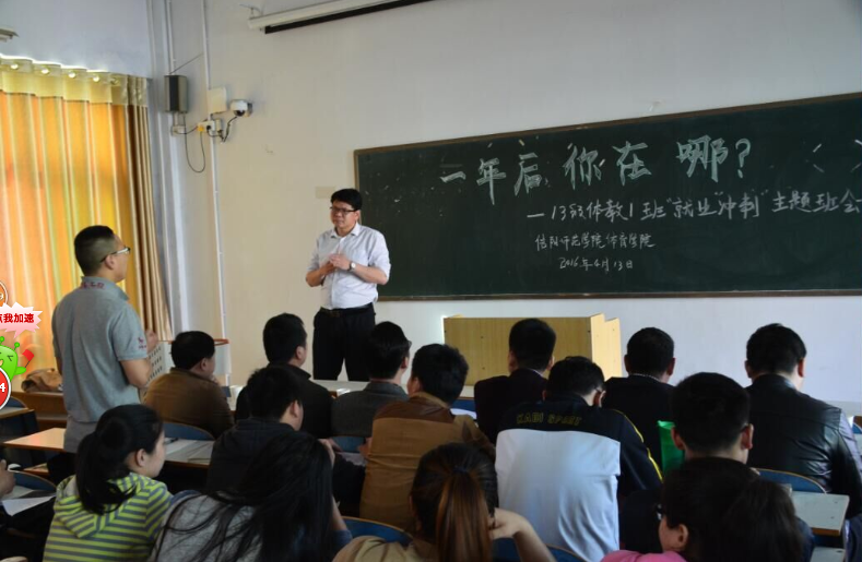 4月13日上午8点,beat365英国官网网站辅导员柴九昌老师在教九楼402教室召开“一年后你在哪?‘就业冲刺’主题班会”。指导、交流此次主题班会的领导老师有:信阳师范学院党委宣传部部长丁少峰、学生处处长岳宗德、物电学院党委副书记刘百超、beat365英国官网网站党委副书记严彬、物电学院辅导员老师杨勇、外国语学院辅导员老师陈龙、beat365英国官网网站辅导员老师鲁枝鑫、beat365英国官网网站辅导员老师陈卓。