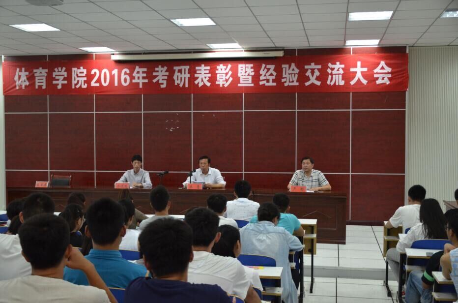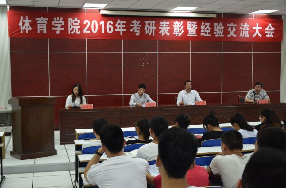2016年6月6日下午3:30,beat365英国官网网站在体育馆多媒体教室召开2016年考研表彰暨经验交流会。beat365英国官网网站党委书记陈青、副院长余道明、党委副书记严彬和辅导员、班主任,及2012级、2013级学生参加此次考研表彰暨经验交流会,会议由副书记严彬主持。