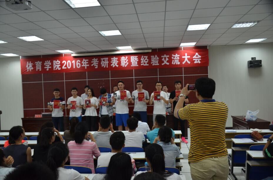 副院长余道明宣读《beat365英国官网网站关于表彰2016年考研学生的决定》后,学院领导和导师代表为考研学生代表颁发证书和奖品。随后,由考研学生代表康东风(考取北京体育大学)、刘美迪(考取北京体育大学)、任乌兰(宿舍四位同学全部考取研究生)、鲁世勋(本年度和鲁世勋一同考取广州体育大学的共有19位同学)等从考研的公共课、专业课、考研的宿舍氛围、互助精神等角度交流了在考研过程中的心得体会,与大家共享考研经验。