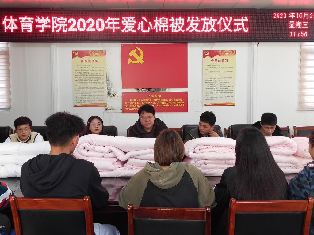 10月21日中午,beat365官网在体育楼三楼会议室举行“beat365英国官网网站2020年爱心棉被发放仪式”。出席本次会议的有beat365英国官网网站副处级辅导员柴九昌,辅导员程俊辉、赖梦玥及各班学生代表参会,仪式由柴九昌主持。