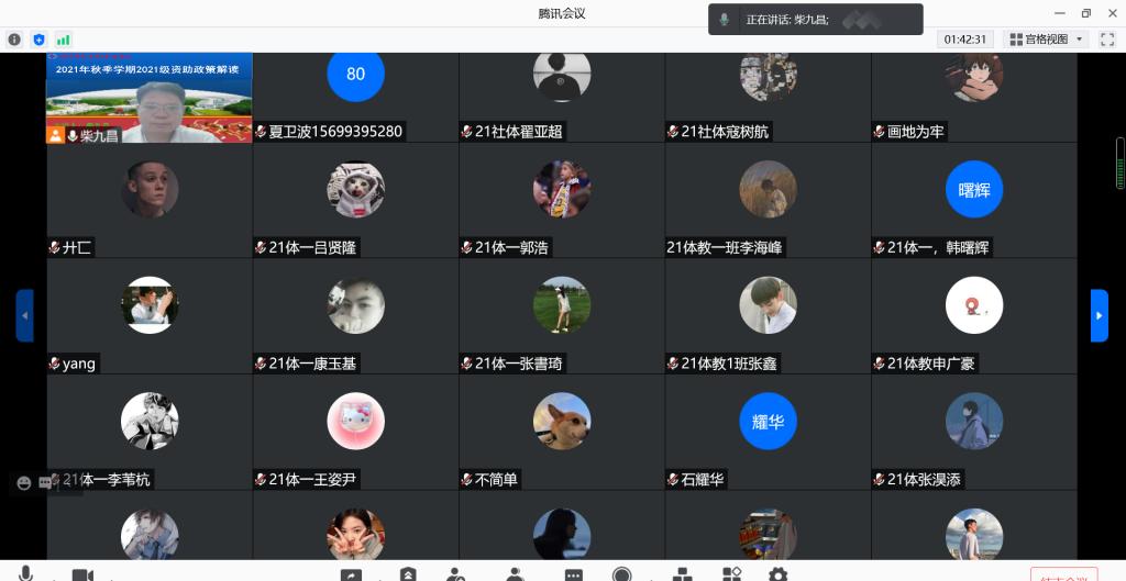 9月22日上午9点,beat365官网通过线上方式成功召开了2021级新生资助政策宣讲会。体院学院副书记柴九昌担任宣讲会主讲,21级全体新生参加此会议。