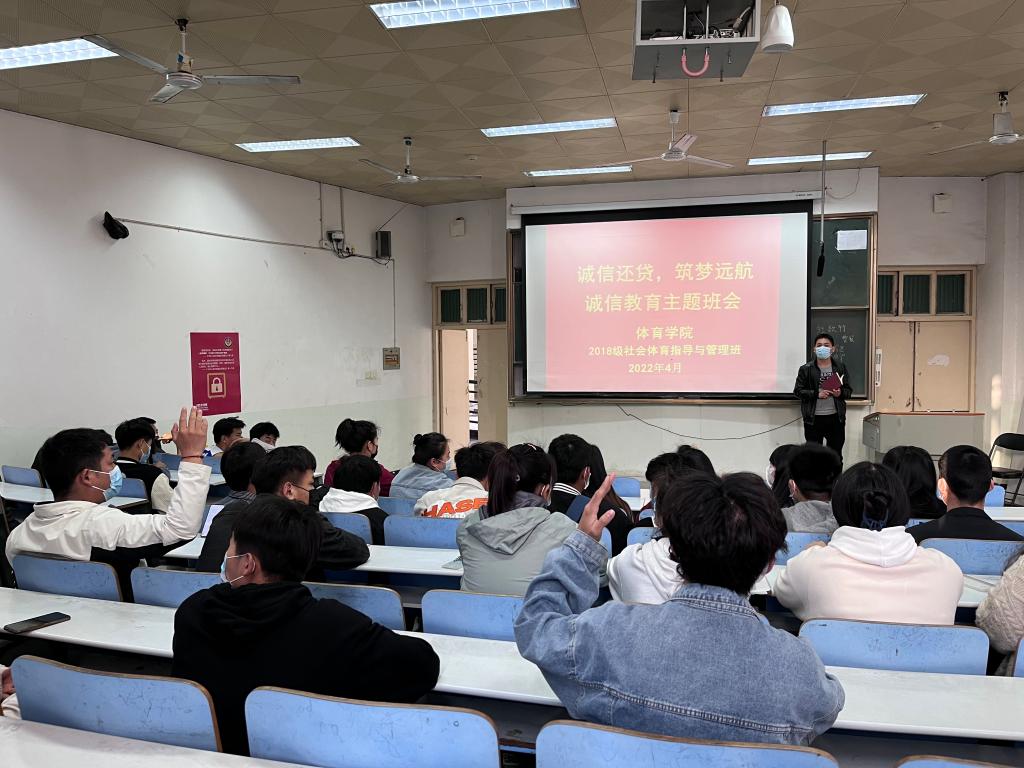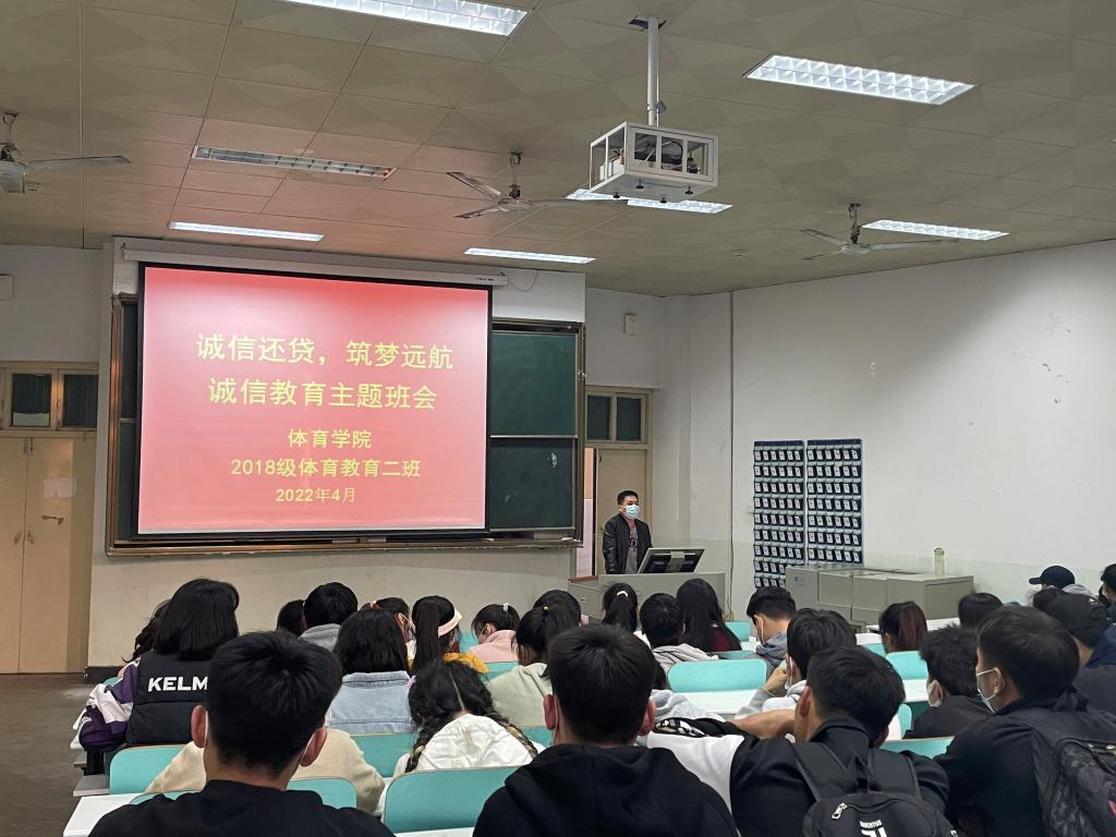 为了更好做好毕业生助学贷款还款工作,加强毕业班诚信教育,413日,体育学院2018级各班分别在人文楼109、110陆续召开诚信还贷主题班会,资助专员程俊辉主持班会