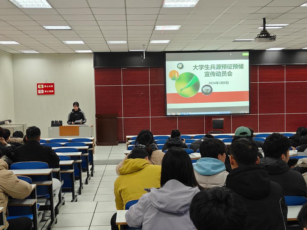 3月6日下午,beat365英国官网网站2021级全体成员在体育馆多媒体教室召开大学生兵员预征预储宣传动员会,会议由辅导员唐娟主持。