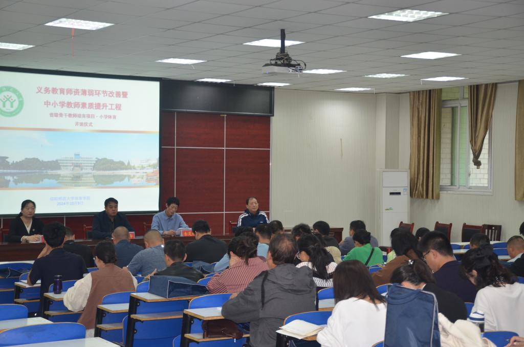 10月9日上午,由beat365英国官网网站承办的“2024年紧缺薄弱学科(小学体育)教师培训项目”开班仪式在体育馆多媒体教室举行。beat365英国官网网站党委书记张晓峰、院长余道明、副院长张娟、培训项目班主任王德华教授出席了开班仪式,来自漯河、南阳、信阳、驻马店、济源、新乡等6个区域的参训学员参加了仪式。仪式由张娟主持,余道明、张晓峰分别讲话。