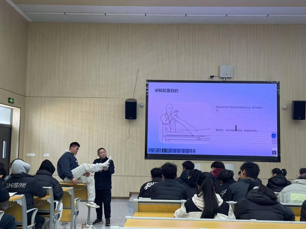 晋伟老师给同学们介绍了人体穴位,并对常见运动损伤的成因及康复按摩手法进行实操展示。此次讲座不仅提升了社会体育指导与管理专业学生的专业素养,也为其未来就业开拓了思路。