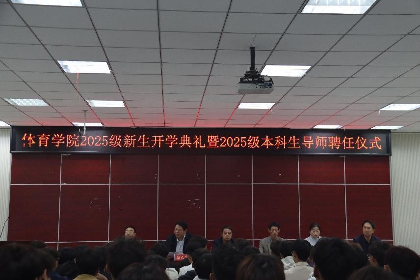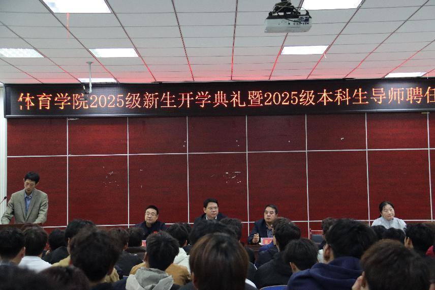 2025年10月9日,beat365英国官网网站在体育馆多媒体教室举行2025级新生开学典礼暨2025级本科生导师聘任仪式。beat365英国官网网站党委书记张晓峰、院长余道明、党委副书记柴九昌、副院长张娟、张翔、杨晶伟,全体科级干部、辅导员,2025级体育教育专业本科生导师以及2025级体育教育专业本科生、2025级研究生参加了此次会议,会议由柴九昌主持。